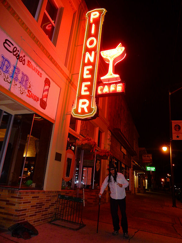 It was getting dark out so I went back to the hotel room to dress up, put the top hat on and stroll the town with my cane. I really wanted to go to the Lassen Ale Works which sits at the site of the Old Pioneer Saloon. When we walked in we did not know where to sit and Tammy was like everybody is staring at you lol. When do folks not stare at me I guess that life up here is a bit more conservative compared to Virginia City where women walk around in corsets and men wear top hats lol. But its all good I just joined the party that is what I went their for ale and good food.
