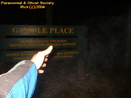 We started our long walk back to the car down the dirt road again hearing the same gnawing sounds. We did not run into any big cats here perhaps we are lucky we did not since this area is quite secluded. I then took some photos of the front side and reached my hand out to one of the entities I could feel it touch my hand. Eventually I felt it go behind me and Tammy felt it just standing there as well. For a while I worked with the ghost surrounding the sign to the Gamble Place. I wanted to bring you photos of an entity near the sign it just helps perhaps to show how haunted this place was so we did spent a lot of time at the main gates.