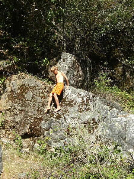 My day at Tiger Creek in April of 2008 would be like no other as a local told me about this location. I thought to myself why not roll a blunt.....pack a lunch...get the fishing poles and take the lion for a walk. We drove up past Pine Grove its a town up in gold country very woodsy part of the El Dorado National Forest just east of Jackson CA. When we arrived it was getting very hot out.....we had walked past the power plant....sneezer was panting and overheating as I was hiking with him. It was a cool area because they had rapids.....giant rock formations....steep hills with trees.....a reservoir like area with still water etc. I liked the little trails that led down to the water. We hiked almost a mile in and found an old dam where we walked down the stair well. Their was a guy later that came along and jumped in the icy cold water. These people in the mountains do not seem to care if the water is cold but my ass walks on water just like Jesus when I touch cold water. I threw sneezer in the water he swam back twice. In addition I had to throw my son in there actually that was more like a joke kids and their temper tantrums. It was a rough trip my son shit his pants cause he could not hold it....I had to wash him in the stream.....their was no trout biting at all. I instead went hiking climbing boulders bigger then me that was alot of fun accept for the thorn brush we encounters along the trail. I wanted to look for caves I know they are present in the area it would be interesting to explore it further. The power plant was much like the one on the Moke River same architecture and everything. Their was a really pretty girl in a little bikini that was sunbathing near us just further down stream. Everything was coming out with her I got the full view. I hear alot of stories about gold being found in this stream so it would be nice to do some panning here but also some Bigfoot searching also. When I packed it up their was a group of people hanging at the picnic area tons of guys, girls, dogs and kids. I wanted to join in the fun so bad but that's just me lol. I went up the mountain a little ways parked....went to an overhang near the edge of the water....sat on a fallen tree and smoked a joint. I mean its just something you have to do if your going to party up at Tiger Creek. There are other pull off areas but keep in mind your right in the heart of Jellystone so you know its a beautiful location were visiting.
