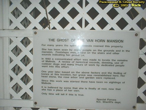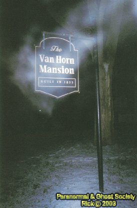 I finally noticed a little wooden tressel and a tiny chair. I went over to it seen a sign on the ghost of the Van Horn mansion the photo taken of it is clear so all can read it. I turned the