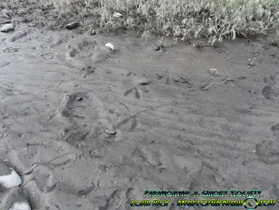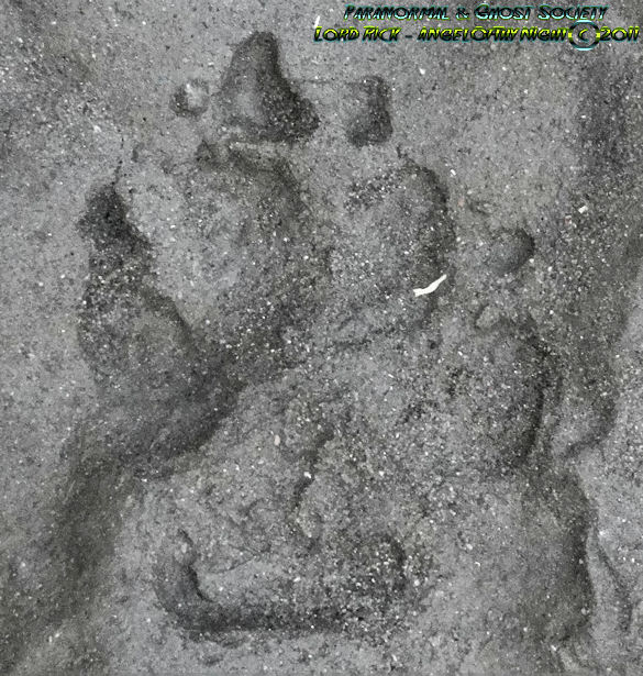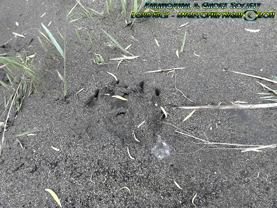 Nothing paranormal here just a big dog print maybe even a wolf in the area as it was found close to the river. Now if you compare some of the other tracks with this dog one you will see they are entirely different. Dogs have pads on their feet which can be seen in this photo. There claws are not very log more elongated and stubby unlike in some of the other exhibits where the claws are very thick as well as much longer. This track is KNOWN!