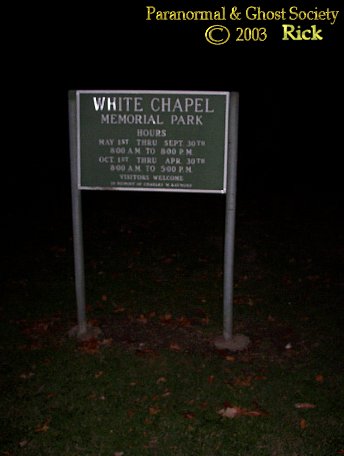 White Chapel Memorial Park Cemetery is what it is... a park dedicated to the soldier who perished in WWI and WWII. Also there may have been some burials from the Vietnam, the Korean war and any other wars within the last century. This was one of the first cemeteries I have ever been in that was a park and cemetery all in one. It sort of feels odd though there is 1000s of flat stones and you never see any monuments or anything of the sort. It is quite easy to walk on peoples stones and not even know it. The cemeteries main entrance is absolutely gorgeous 2 giant stone archways with rod iron gates and a little dedication in the front. The creek runs along the memorial park and there is 100 acres of roads, grassy knoll and giant oak trees. Many of the the stones have a flag, flowers, wreaths Ect by them. Do the departed soldiers haunt this cemetery? Yes although many of them hide behind dark patches of trees or move rather quickly perhaps they watch out of curiosity. Our first visit here and probably our only visit I managed to capture very few ghost you know they are there you can feel them but they very sly in avoiding the camera. The area is very peaceful though you feel so safe here it is the type of place you could sit and look at the stars it is a place of spiritualism a place where one area is the divided in sections such as Jewish Sections: Beth Am Section, Temple Sinai Section and a Mt.. Moriah Section. The cemetery is untouched and not an ounce of vandalism. I thought perhaps this place would be more haunted perhaps because some soldiers died of some violent deaths and some perhaps unhappy with what occurred in the past. What is here is very happy though and at peace and so will you if you ever have decided to plan a visit here. © By AngelOfThyNight-Rick |