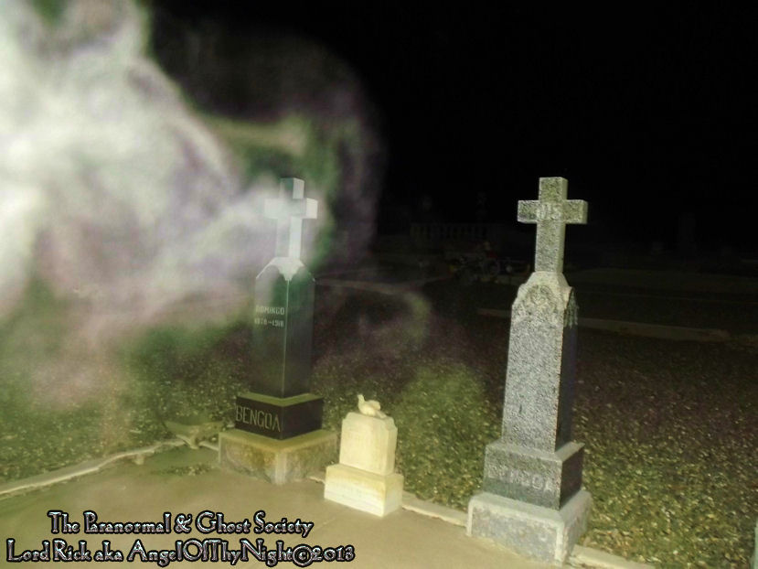 Something appears to be standing behind this tombstone. If you also pay close attention the mass of ectoplasm is very dominant to the left and right but is not a full manifestation.  In the upper left hand corner that is not paranormal it is my own hair that got in the way. However the ectoplasm surrounding the grave is very genuine and could be two seperate masses all together.
