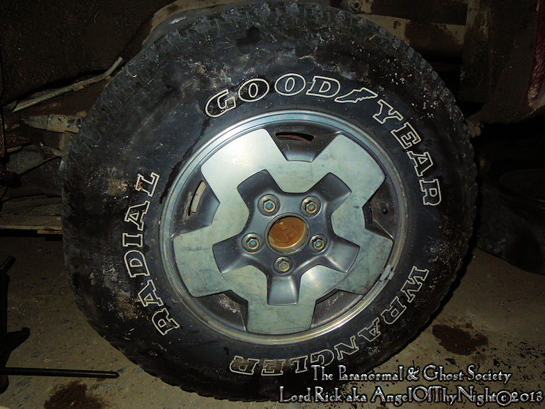 This is the tire that exploded near the cemetery in my face. It was so loud that three people came out of a nearby gas station thinking a gun went off. I also had to fix the tailpipe which came off the bracket hence the jack to the left. I will never buy these tires again Good Year sucks! Due to us being stranded near the cemetery it led me to investigate this location and spend the rest of the night sleeping in my vehicle till morning.