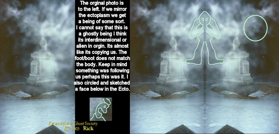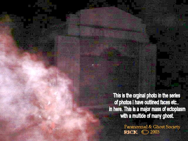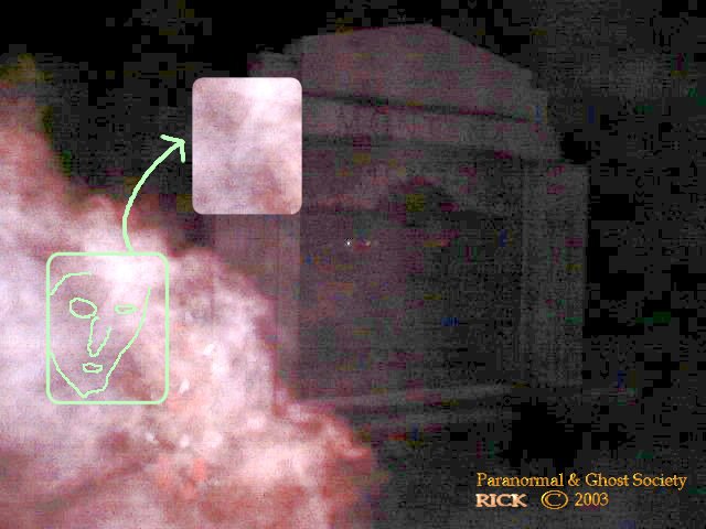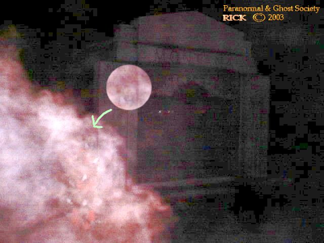 disappear nothing was found but all 3 of us did see it. It seemed to be tall so we know it was not some piece of garbage rolling on the ground. I did take lots of digitals in this cemetery but only a couple came out 2 of those I will say are pretty interesting ectoplasm photos one seems to be half of a mans face I captured there. I did notice lots of fresh burials so that might explain the curious shadow following off in the distance perhaps its a lost soul they have no idea they are passed away and they are just curious as to who we are