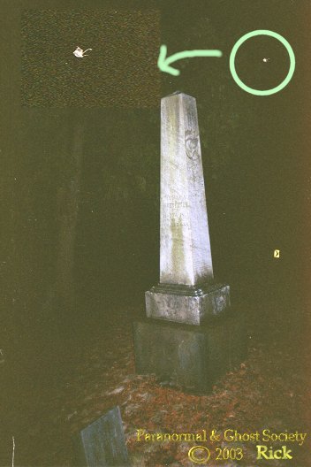 It was a warm night...50 degrees, balmy, so that would rule out any "fog" The group split up in the cemetery, and each got his or her own pictures. You could feel cold spots, and that is where I took my pictures. I captured an orb, and a ghostly form or two right next to a tombstone. My camera died just as we were about to leave. Rick has mentioned before that ghosts will drain your batteries, so you always need to carry extra!