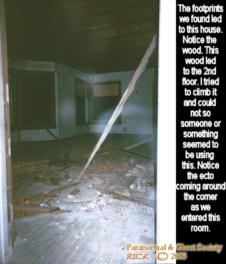 furniture possibly from the castle. Such as old beds, desk, tables pretty interesting. We then checked out another old house right near the castle this one was a challenge to get in considering half of the stairwell was gone but we got in and the rooms were very large and the vibes were high and I did capture something in this house on my digital camera. We then hiked a ways up the hill and found a large house all wood probably one of the oldest this is where things get interesting. About half way to it Pete and I discovered footprints they were that of a