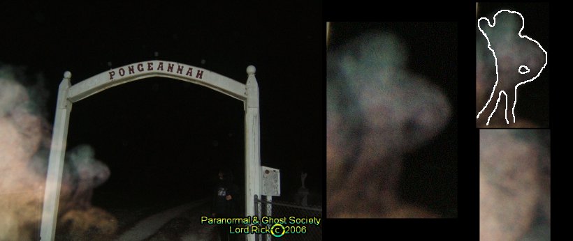 Subject: Last Night's Adventure Report Date: Sun Jan 29, 2006 2:24 pm To: ParanormalBuffalo@yahoogroups.com, Paranormalflorida@yahoogroups.com, ParanormalGhostSociety@googlegroups.com,paranormalghostsociety@yahoogroups.com, ParanormalGhostSocietyConnections@yahoogroups.com,ParanormalGhostSociety@groups.msn.com, TheParanormalGhostSociety@yahoogroups.com, pgsociety@groups.aol.com, SupernaturalFlorida@yahoogroups.com From: LordOfThyNight@aol.com Ponceannah Cemetery (Investigation 2) At this time it was getting really late and the sun was going to be coming up soon. We pulled in and I wanted to show Jason and Ariel where this road in the cemetery led to which was to that area we were stuck at if we were to stay on it. Driving through the cemetery Ariel seen what appeared to be a ghostly car driving along side of us. She said to me hey Rick there is a car parked in this cemetery. I assumed it was just a reflection off a gravestone but she swore up and down of seeing a vehicle going parallel with us. I parked and shined my light to show her there was no cars other then us here. This is a real secluded cemetery but this time it did not have as much of an eerie feeling. But this is an old pioneer historical cemetery and its secluded great for a return trip. We walked around many of the old graves and it was pretty quiet. I could see a few times the ectoplasm moving around in the cemetery in front of my flash. I also noticed the sky getting lighter as if the sun was getting ready to come up. At this point I could see most of the entire cemetery it was not as dark as last time we visited. In the older section something grabbed Ariel and tried to whisper in her ear. She said it sounded like mumbling like they could not get the word out or did not have enough energy to finish the word. We made our way to the front entrance took a few photos all was calm. On our way back to the car by the old well we heard a scream like sound maybe it was a bird or animal. But it sounded like a giant cat then it changed to a scream. Maybe a panther possibly in the woods or something. I went up to a few old stones we really were getting tired so we just photographed some of the older graves and Ariel seen something ghostly off in the distance just standing there staring at us. It appeared we were not alone after all and so we ended the night on a ghostly note. Jason ended up wandering off as we were waiting in the car so I started the car up and started to drive real fast down the cemeteries dirt roads. I never seen Jason run so fast in his life. He was chasing me waving his flashlight all over the cemetery. I gave him the finger out the window and drove right to the entrance stopping on a dime. It was just so hilarious and I do not blame him I would not want to be left at this secluded cemetery. We got in and half of the sky was bright still no sun but it was starting to come up and so we made our way back home. In conclusion to last nights adventure it was quite a night all the way from car chases, to ghost sightings, to an encounter with a mysterious person and of course getting stuck in the middle of nowhere. It was a very exciting night and I am pretty sure we captured some great photos at Lonesome Oak Cemetery, The Leesburg Train Station, Paisley Forest and of Course Ponceannah. I want others to keep some things in mind about these investigations. First off and foremost investigations are dangerous one reason we ask for donations is because out of all the paranormal groups in this country nobody works as hard as us. We have many young amateur ghostbusters out there and believe me some things should be left for the experts. The world is a dangerous place especially when your venturing out into the night you got thieves, homeless people, people who may not be mentally with it. The work we do is very dangerous it seemed like every place we visited we had some kind of problem at. Hell even looking for the places were rough enough. Please keep in mind never go into an abandoned building yourself and if you see people the best thing you can do is avoid confrontation. Last night we took a lot of risk and overtime you know when to take them and when not to. We have done hundreds upon hundreds of investigations so every situation we encounter we handle like a grain of salt with caution, intelligence, and common sense. Some people you might run into might not be so nice and of course as a ghostbuster we face many obstacles. We face getting stuck somewhere, possibly breaking down, dealing with entities who might not be so nice as well as people. Each corner we turn holds a new surprise and a new beginning. With that in mind all we ask for from our fans and the paranormal community is for your respect for the hard work we do and the commitment we have made to bring you such great adventures. Peace, PGS Founder Lord Rick