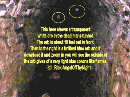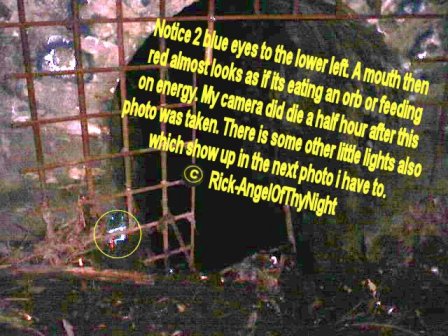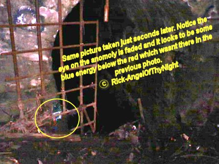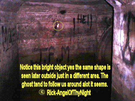 Well tonight was a quiet night I cant say we experienced a a whole lot my cameras batteries ran out so I couldn't take Pics but ill be going up there many more times even during the week with anyone to see if we can see or hear something. I can say that there were a few distinct and interesting things. For one when we first entered into the tunnel and I don't know if this was meant for me but I seen an arm it looked like the arm of a older person it was very transparent if you look where it says hell in trays photos below it is where I seen it. It was pretty startling since i'm almost sure what it was I don't know if it was a residual thing or maybe something luring us in deeper for what reason who knows. No cold spots in dead mans tunnel but there was a time when we stopped to talk or rest actually switch positions walking and I heard something deeper into the tunnel I cannot pinpoint the sound it wasn't a rat because they scatter it was loud sort of like something else maybe walking in the distance because the echoes came back to us. I also noticed in the tunnel where it says hell a bunch of railroad spikes piled in there Tracy and I did not see them last week so was this a spirit trying to tell us stay out or maybe seduce us to go in further. I got to say john Edward says that its the little things you got to notice because its a way for the spirit to validate that its there and this is true. A week ago the tunnel had stacked wood then the railroad spikes, then that face or large orb we captured last week its really hard to say. my friend doesn't talk much about that place since he use to go up there a lot as a kid. The cemetery was a dead cell tonight no movement in the trees or on the tracks I thought I seen something move quickly and again I could be wrong I usually have to focus and trains going by ruin that. As far as the whistling Jeff whistled and a tune and i'm almost sure that it whistled a part of that tune back very far off and all there was also one area that was ice cold. I think tonight was a omen to stay out Tracy dropped her camera in the water then the flash light I believe or her pack fell of and me seeing that arm and hand I mean its these things that are warnings we got to look at. I really want to thank Jeff and Tracy for coming along again you guys are great. Its nice to have people to go along and do these things. I am looking to expand the investigations to further areas or more intense haunted areas cemeteries are good for orb photos ect. I have been noticing strange activity around my house to not so much in it just outside of it i'm not sure yet if what was at St Mary's followed me home but ill say this there are spirits wherever we go and its not always what you see, heart, feel ect sometimes its what the camera captures an some things are only meant for certain people to see tonight again though I did see something strange it was 10 feet in front and not hard to miss I don't know but I been trying to piece this all together like a puzzle, seeing an arm, then the singing man last week, the black figure, the rolling down the tracks, then the rail road spikes what does it all mean we may never know. However St Mary's i'm sure is hot and cold like any cemetery I may have to go up there 40 more times to see another black figure who knows but its not going anywhere and either is what roams there. Notice above to the upper left the demonic face this tunnel really makes my hairs stand up.