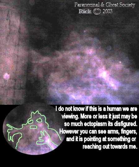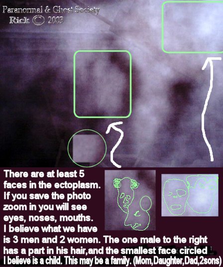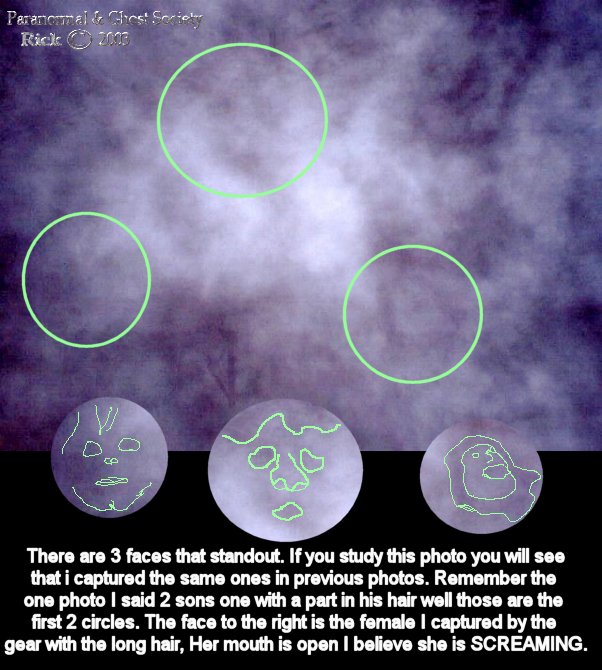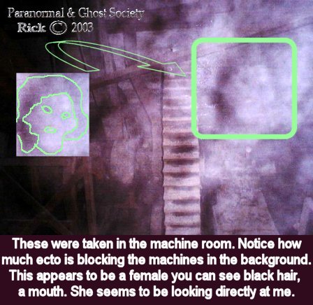 Subj: [ParanormalBuffalo] Other Report Of The Grain Elevators..... Date: 2/9/03 1:02:50 PM Eastern Standard Time From: AngelOfThyNight@aol.com Reply-to: ParanormalBuffalo@yahoogroups.com The grain elevators last night near the Aquarama proved to be a very worthwhile trip to check out. Pete and I entered them around midnight. We walked all around them and to be honest with you I cannot even describe the size of these monolithic structures. You got buildings attached to the grain elevators and buildings way up on top of them to. Near these grain elevators we ventured into there are about 4 others like this within a mile or 2 away some 3 times the size of the ones I went in last night and some very dangerous and collapsing. However we managed to get in now keep in mind that grain elevators were a booming business over 50 years ago this one has been closed for over 40 years. As we stepped in both Pete and I got that feeling like get out you don't belong here. Last time we stepped in there we pretty much got in and out this time we spent alot more time taking photos and having a look around. We started off by looking into the machine room with its large cogs a very rusted stairwell going up which we did not even manage to go up. Then we the further we went the more slipper the ice got and we did notice it was snowing inside. We explored 2 more rooms dead end ones alot of the old supplies rusted and left behind remnants of the past. Those rooms seemed to bother me a little almost like we had something in the room or behind us perhaps trapping us in just an overwhelming feeling. We then made our way to back noticing dozens of pillars through out them. What was really neat is being able to look up the silos itself when shining your flash light. Then we made our way back getting lost in dozens of boats being stored there. About half way back we heard a voice i could not make it out but it sounded like it shouted at us and it sounded close by we froze. To the left of us there was a plastic sheet of wrap something you would cover your motor on your boat with. That started to violently shake. I know the winds outside on the lake were 30-40 mph so its possibly that an air current made its way inside. But the whole time we were there this did not occur and that was odd since the wind was constant on lake Erie. This is right after we heard the voice keep in mind. After it stopped it sounded like something stepped down near the plastic wrapping it was sort of a cracking sound. Keep in mind a sheet of covers the flooring inside these grain elevators and when we walked on it there was a crack every time. So i definitely then knew something was there with us. We took a few photos as we made our way out Pete and I pretty much stuck with our digitals for this since the whole place is made of concrete. When we got home I looked at his photos and one of his last ones has the face of a man you can see the ear, mouth, eye and he seems to be bald. I did look at my photos as well and I seem to have a variety of different apparitions in them some photos came out great some did not but from what I can see is no matter what area I went to I caught something there most of them look pretty pissed or lost. Keep in mind rumor has it that before boats would be stored here they were dumping grounds for murder victims, plus I am sure workers fell and had accidents over the years in them. All in all it was a interesting night. The only thing that was a low point was my cheeks and ears freezing as we walked to the grain elevators itself right near the lake. Pete and I found some more grain elevators we will check out in near future also a abandoned restaurant haunted by a civil war ghost which we will look into next week. We did take a ride by the newly parked ship docked by general mills this one will be a tough one to get into since its owned by them and open 24 hours a day but all good things come in time. peace Rick The photos below are all of ghostly faces and figures some are hard to see unless you study them for a little bit. You will see eyes, noses, mouths on most of them. In 2 of the photos in different places I caught the same faces.