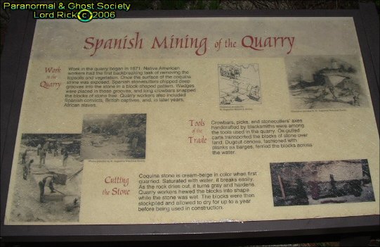 More then three centuries ago a quarry was located on this island which was at one time Native Americans hauled out blocks of rock from it. When that population died off or migrated south in FL the quarrying was left to African Slaves. Hand tools would be used to cut out blocks of the soft shell stone and squared were pried from the natural layers of rock. The blocks of coquina would then be loaded onto an ox drawn cart then barbed across the Matanzas bay to St. Augustine. Some of this coquina was used in the construction of Castillo De San Marcos, Fort Matanzas, Private Houses and even public buildings. So as you can see this was an important investigation for us because it has a connection to everything you currently see down St. Augustine. The island back in the 1500s was plagued by pirates and Spanish soldiers during that time always built their homes and forts out of pine trees or palmetto. The problem is that storms or fire could easily destroy such material. So the Spaniards wanted to discover a way to overcome this so they discovered this building material which is made of rock material deposits and broken shells. In the 1500s the Spaniards made a small gunpowder storage magazine it was not large but it was the start to many other structures that would follow with this type of material. In 1671 the quarrying increased and the Spanish called it "Cantera" which means in English Quarry. We investigated the main quarry on the island which has been worked into a state park but their are other ones very few people know about. Also near the site is the old St. Augustine Amphitheater which we also found on our hike. Coquina rock is fairly soft and its easy to cut while in the ground. Once exposed to the air it can harden. The Spaniards learned to water proof this rock by coating them in plaster and paint. The test eventually did come when Fort Castillo was bombarded the walls absorbed all the cannon balls. Eventually the British used it in 1763 and then the Americans in 1821. Alot of places we go are coquina structures even most of the sugar mill plantations. Wandering the island was a real treat here we sort of felt like pirates stuck on an island. We could hear the ocean near by as we walked the dark sandy trails. I have to admit this was more fun then haunted by the history here is quite interesting when you think about pirates and centuries of quarrying being done. Some of you are probably not aware of it but we investigated the lighthouse which is also on this island and we got some good ghost activity hearing the little girls that haunt it late one night. I mean the island is what it is its haunted but when people hear of this island they directly think lighthouse very few are aware of the old quarry. You can read more about the lighthouse on the island by Clicking Here: Saint Augustine Lighthouse which we also investigated and explored. © By Lord Rick-AngelOfThyNight