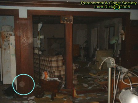 Above what you will see to the left photo is the den. This is the most haunted room in the entire house. Let me explain to you a few things. The images to the right are enlargements taken from the orb video. I put the photo above to give you a perspective of where we were standing when we caught the EVP and when we captured the orb moving. Let me explain to you in detail what occurred here. First we heard a moan near the stairwell about 10 seconds later an anomaly shot out from left to right behind the couch you see in the photo. It shot across then downwards then back up and away from us in a two second time span. Its as if the entity that moaned was on the move when he realized we were downstairs he shot away from us. Now in the photo you cannot see the stairwell so let me give you an idea where it is. If you look at the couch between the two wood columns it just lays a few feet past it and to the left. We know this footage and EVP is genuine to to the time span this activity happened was all within a few seconds. We did film the entire investigations of the house on night vision camera and out of the hour of filming the activity was highest upon just entering the home. It would appear to me whatever was here made a attempt to scare us off. The links are below click them if you dare!
