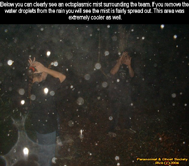 I heard a voice in the woods I do not know what it was but it was close. Other then that the pouring rain really made it hard to see me flashlight was not even penetrating the blanket of rain we were faced with. The group spread out a little and we covered various areas. There was a real dark area that made me very uncomfortable I felt so watched.