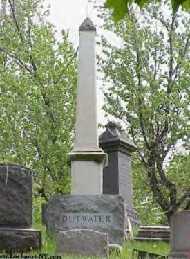 The most famous and generous of the Outwaters was Dr. Samuel Outwater who practiced medicine here. After retiring from practice he moved to the Oakland, CA area where he died in March of 1953 at the age of 95. His ashes were brought back to Lockport by his widow, Alice, and were placed in a plot at Cold Springs Cemetery. Other members of the Outwater family are buried here at Glenwood around the family monument pictured here. Alice died in Septemer of 1968 (also in Oakland) and her remains are also at Cold Springs, not here.