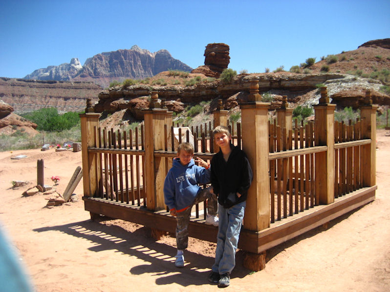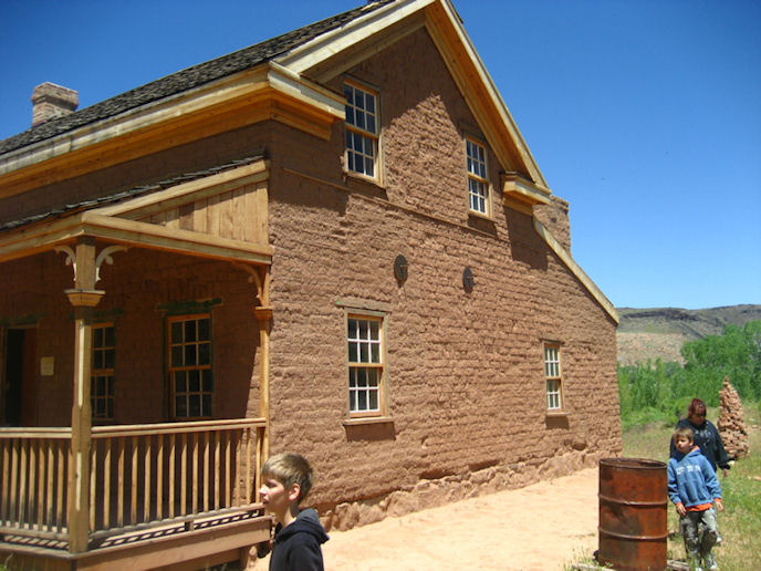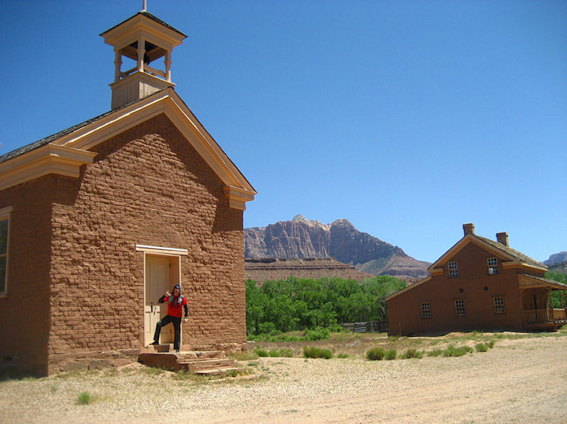 The old town site displays several original buildings including the 1886 two-story adobe school house, which is one of the most photographed ghost town structure in the American West. The site also includes the adobe home of the Alonzo Russell family, built in 1861. His son, Frank and daughter-in-law Mary Ballard Russell moved into the house in 1917 and lived in the home until they moved to St. George in 1944. They were the last residents to leave Grafton. The 1877 John Wood Home, made of brick, also stands, along with a log barn and log granary, all surrounded by a historic split rail fence. The 1907 wooden Ballard Home and barn also still stand. Another home, also owned by Alonzo Russell and built in 1879 also continues to stand. Up the road from Grafton is the 1862 Grafton Cemetery, which continued to serve residents until 1924. Grafton, located just south of Zion National Park, can be accessed by driving to Rockville, Utah on UT-9 and turning south on Bridge Lane, which crosses the Virgin River on a historic, single-track iron bridge, before the road turns westward. The pavement soon ends and climbs into the hills on the Smithsonian Butte Road, a 9-mile scenic back road to the cemetery. The town site is just beyond the cemetery.