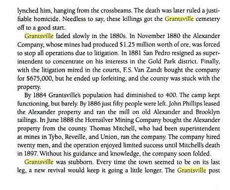 The town was named after General and President Grant of the Union Army hence why the mining district and the towns name took on an eastern overtone to honor them both. When gold was found in the canyon their were only about 50 miles at that time the canyon was lined with tents.  The miners ate beans and this life often came with a price sometimes that was your very own life.