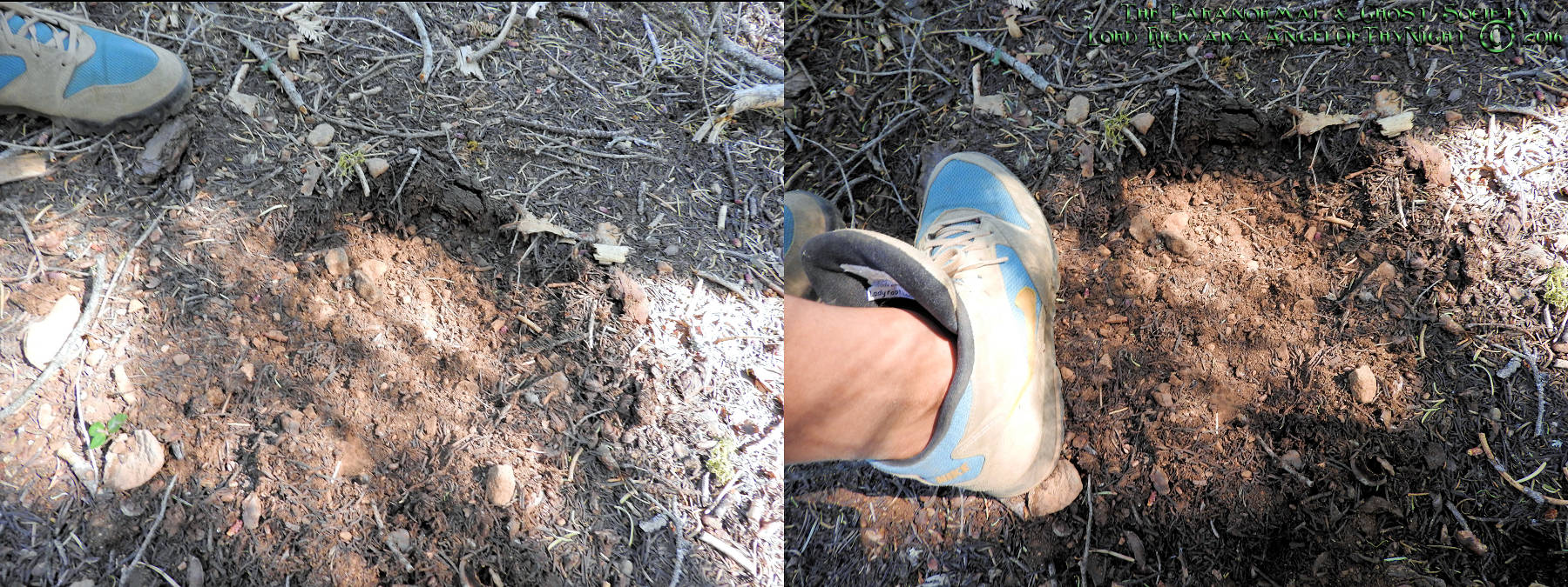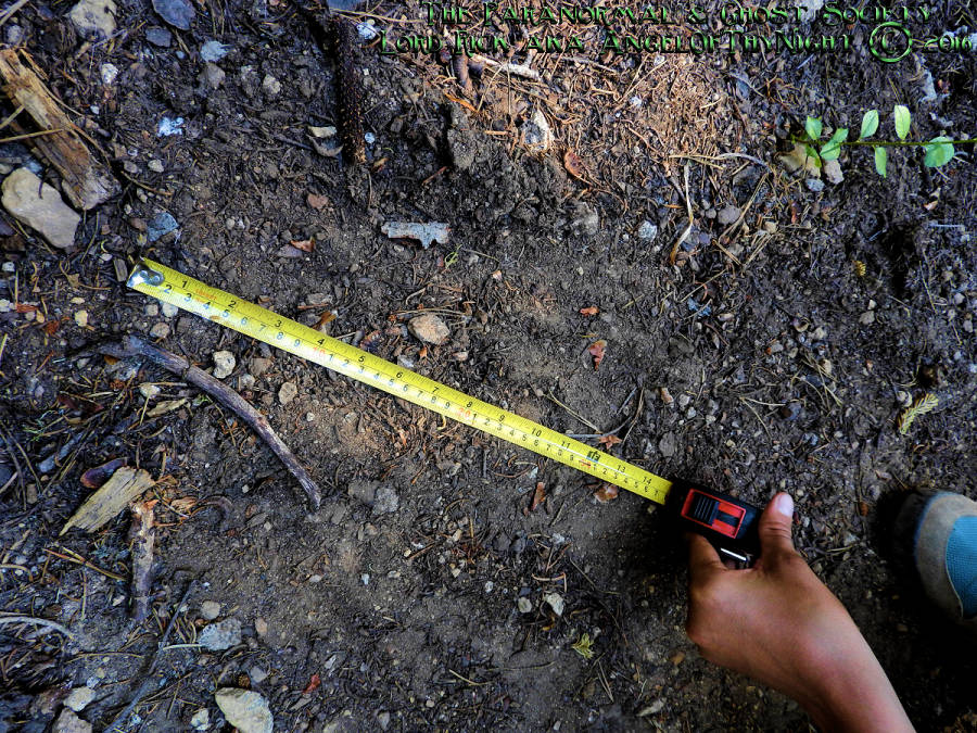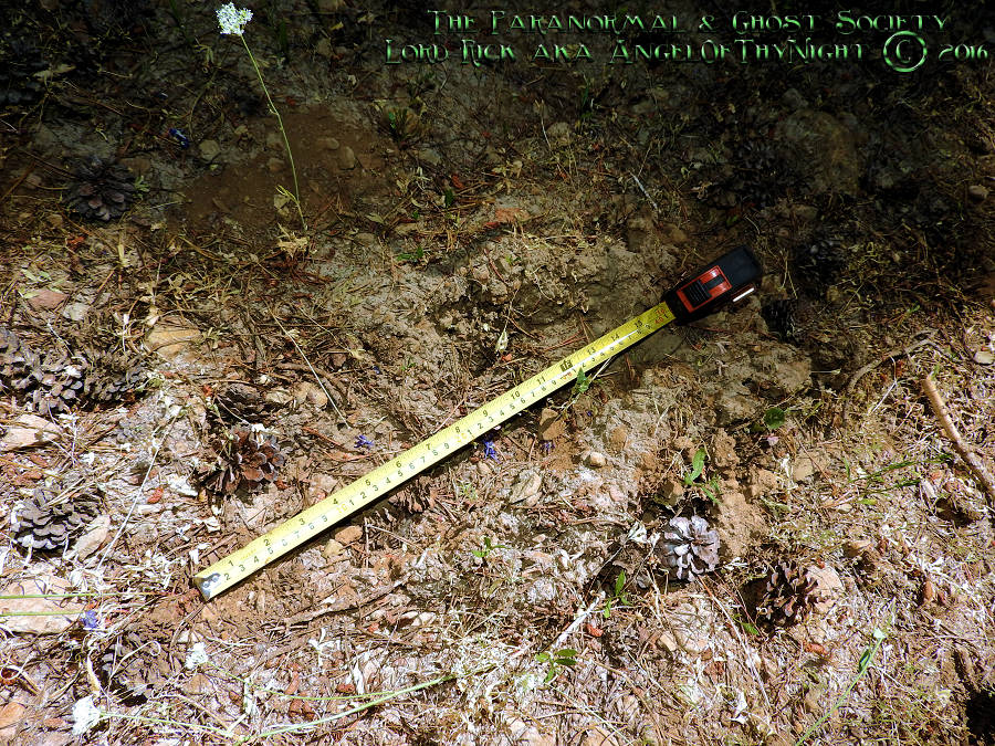 The tracks above are very old but two things stand out about them A. The sheer size is somewhere in between 14 to 15 inches & B. Whatever made them had weight to it because the dirt was puts outwards when whatever made this touched down. My guess is whatever made these tracks had quite a large foot in gerth and its obvious in length too. Mud or softer earth is not usually found here and the terrain is very rugged. As far as the photo of the track below its very weathered you would have to be physically standing next to it if you wanted to see the compressed earth. The topsoil has been displaced perhaps pushed in different directions from a foot touching down maybe even a muddy foot that displaced most of the topsoils pine needles when it had touched down.