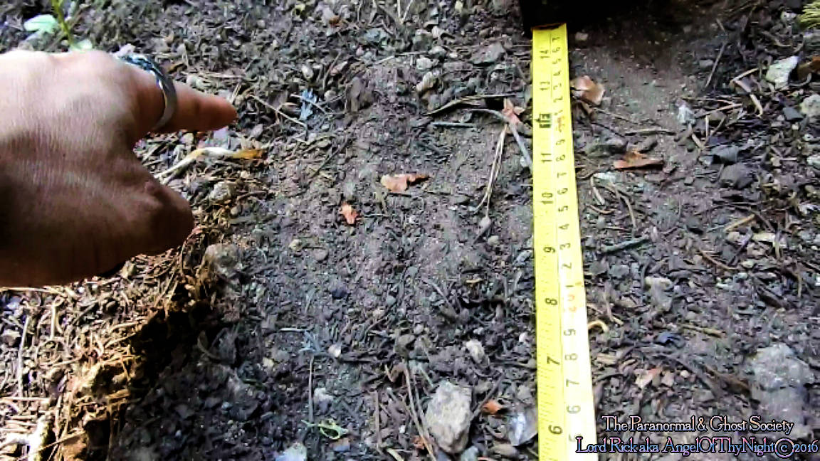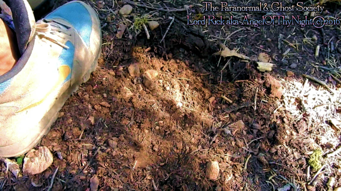 We found this track in a dense patch of woods just above the meadow with the coordinates we were given in the general area of the Bigfoot Kill Zone. I know it does not look like much but the earth here has a soft patch of dirt so we found a big toe impression, somewhat of a heel and some of the dirt had been pushed outward which signifies that whatever this was had some substantial weight to it.  We were have to see another toe but it was faint an I am doubtful a barefoot human made this. I think this is real and whatever it was we heard it while slowly climbing down the steep embankment of the woods. It was strange because we heard something moving around then a huge branch snapped. It was something fairly large and I do not think we were alone. I think we startled it and it ran off to be honest or was watching us which is always an eerie experience when I document tracks like this. After measuring the track we tried to see if we could follow them and strangely this was the only one. But about 30' away was some foliage which we found freshly broken so we knew this is what we just heard! The track was found on the hill side about half way down to the meadow but in an area where that hill leveled off a little and this is what we found so very interesting to say the least!