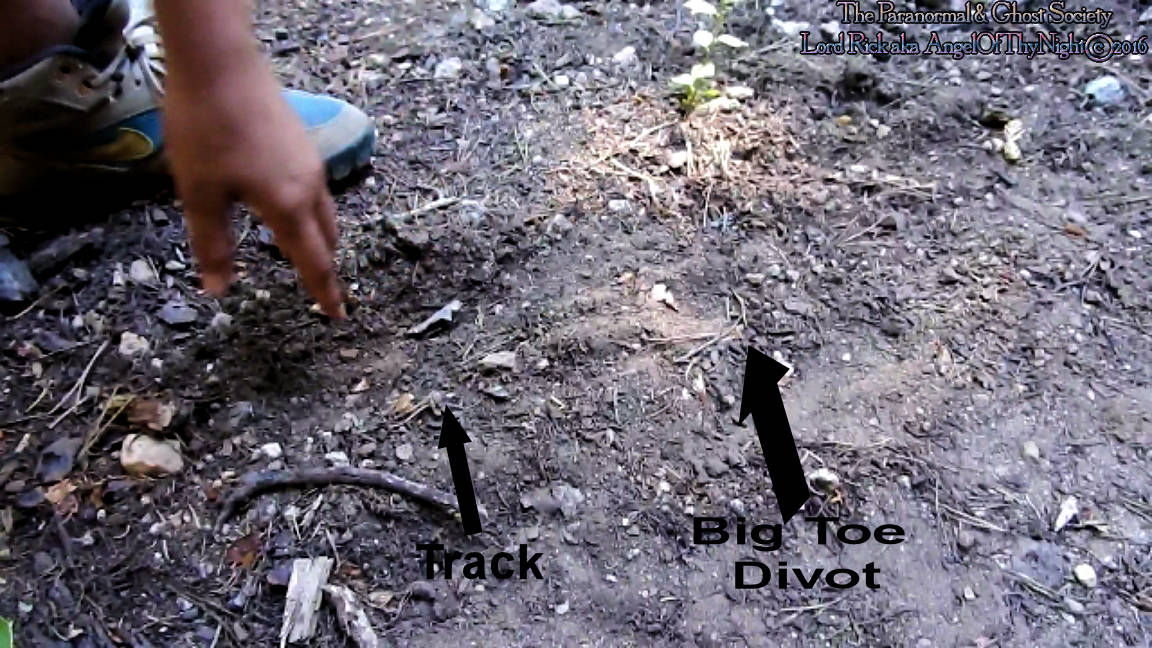 I decided to enter a dark patch of woos below the road prior to the dropoff and as I had started to go deeper down into the woods I hear something moving around even a loud snap. I ran back to my vehicle grabbed the camera because something was in those woods. My son and I slid working our way down about one hundred feet down the side of the mountain,. The woods were dense, dark an not easy to walk down till we found a flat area. This flat area revealed a track to us about id say 15 inches give or take with a big toe impression. The smaller toes were barely visible to tell you the truth but you could tell something stepped down leaving this impression of a toe in the soft sand and the hell. Where the edge of the outside of the food would be some dirt had been pushed outward so it was something larger.