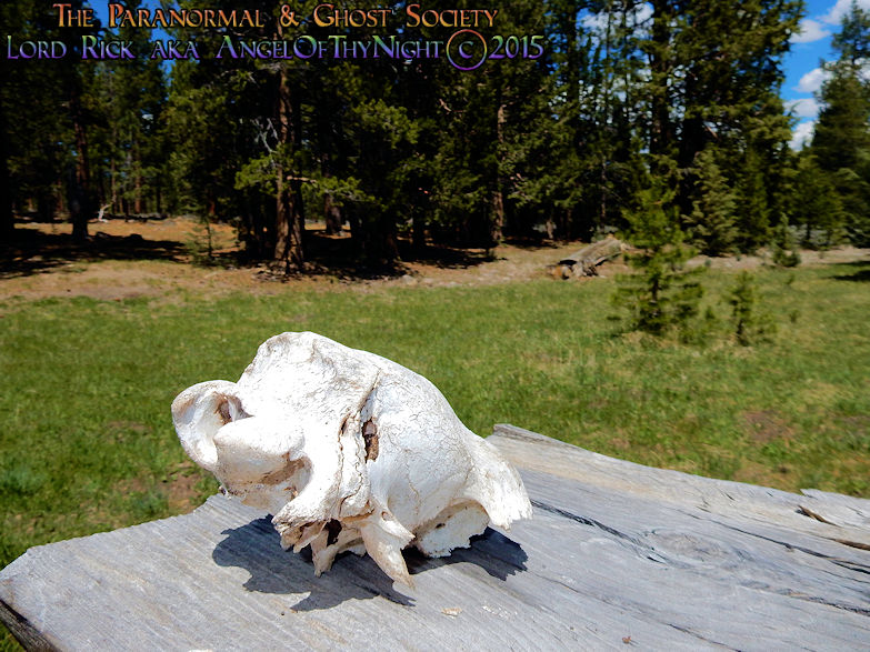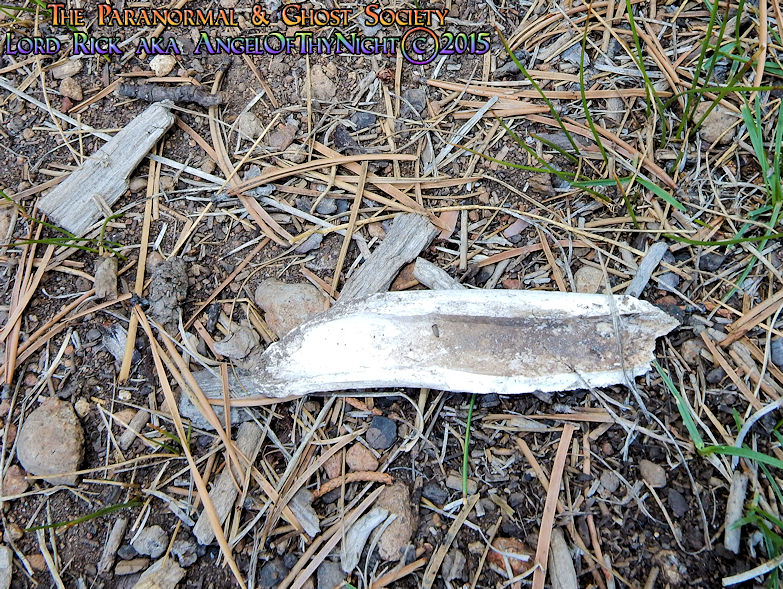 At the camp Tammy found a bunch of bones scattered back here which may not be paranormal but we know there are predators back in these woods. On this trip I seen three types of predators bear, mountain lion and coyotes. Therefore the bones we found may fallen victim to one of these predators although I could not tell what animal they came from. There was a skull at the site which I picked up to study, possibly a leg bone which was split open marrow sucked out of it and then part of a spine with vertebrae still attached to one another. It was not a large animal may have even been a small dog at least based on my examination of the bones and mutilation. I did not see any scuff or teeth scrapes on any of the bones which adds to the mystery.