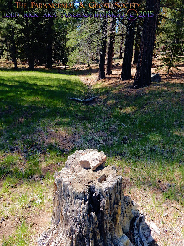 As an investigator I always have an open mind like for example this rock sitting on a stump. Now one might say a hiker left it to mark the trail or you could possibly say that a primate like creature such as Bigfoot may have left it on the stump so that it could be used to communicate with other kin in the area. For example since the flat is very lush you may have a group of deer grazing. Perhaps the male hunts the deer while the female squatch stays back using this rock to bang on the stump to serve as some alert when a hiker nears the area. Nobody knows for sure but we must always open our mind to the endless possibilities our planet sustains. Finding rocks on stumps is not as rare as you would think so I cant say Bigfoot put this rock here but on occasion we do find areas that tree banging has taken place by these creatures.