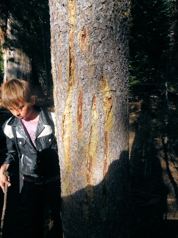 On our way back from the lake we carved our names into a tree with a knife that way I could be immortalized at least for the next 60 years lol. Its very common in the sierras to come across a certain species of tree you can do this with. I just added my name to the hundreds of names already on various trees. By this time a father and his song were heading past us whom ask me how much further they had to go. By this time the sun was setting so the forest was a dark canopy blocking out most of the light.