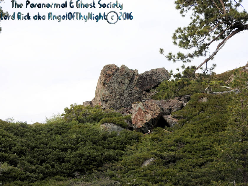 | This is only one of many rock shelters, caves and dens found in the Lakes Basin area. These are the ones you will see while exploring but imagine all the ones you do not need hidden up on some of the peaks found surrounding the lakes. If that is not enough their is about fifty or more miles of tunnels in the sierra buttes which overshadow this region old mines no less and today abandoned. So when people ask me where or how can Bigfoot sustain himself remaining elusive well the answer is really simple. These primitive creatures live underground or in dens like the one you see high up on the side of this hill covered in nearly impossible brush to trek through in order to get to it. You cant possibly sight something like bigfoot if you cannot see him and when these creatures stay in caves it allows them to remain elusive but also stay out of the elements. The natives also utilized such caves some might even contain petroglyphs in them which is why I love this area so much because it offers up so many great things. If bigfoot does not live in a cave like this then maybe something else does like a mountain lion or black bear one must wonder! |
