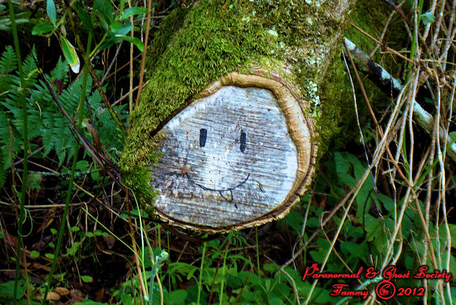 Within the foggy woods their is a location where most trees are moss covered. A face found drawn on this broken log was discovered. Not ghostly but not something you see often while hiking.