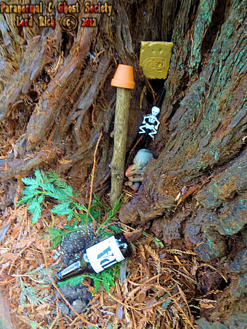 At the bottom of a lone redwood tree on the edge of the Muir woods is an area where tribute is paid. Their appears to be a statue, bottle, skeleton on a stick and a few other items. Its obvious that some ceremonies have been practiced surrounding the tree thus their is some energy in this area.