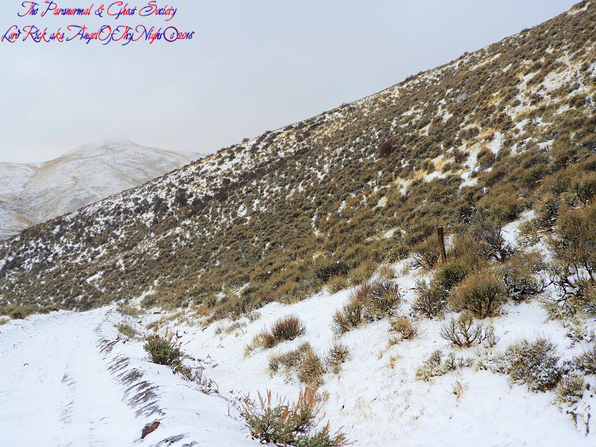 The photo directly above is where the town site stood I seen some rusty relics hidden in the brush pulled over and went a few hundred feet back into the sage brush. While the structures are gone the views have never changed. You can see straight ahead where the two hills/peaks meet to form National Gulch where the gold mining transpired just a short distance above town. I knew this had to be the town site because I seen buried under snow remnants but never did I find a foundation. You can actually see some remnants in the photo above but they are covered in snow. With the photo below this wide open area that you are viewing was where the town resided taken from a mining road just a few hundred feet above.