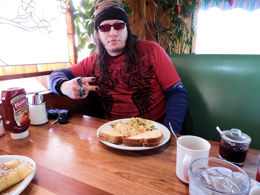| A nice breakfast at the 1948 Griddle in Winnemucca while I had a wild western all around big breakfast my son had some crepes while purposely making faces at me for you PGS fans. Notice the teenage jackelope running off to the right in the background while I was taking paranormal readings. While I did not come across any ghosts or UFOs this certainly was a rewarding ghost town trip trying to uncover National's last remaining remnants including this stone cabin or rather ruins of one that once boasted a fireplace. I did also get a few EVPs at this site so its possible that National may have a few haunts. |