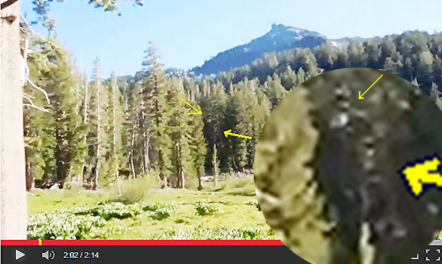 "Noble and Bull Lake part 31" at the time frame 2:02! This was done so through a viewer of our youtube channel who spends time looking at our videos for possible Sasquatch hiding in the woods.  In one of the enhancements it looks like a chimp high up in the trees. If you also pay attention one of the creatures has a fairly large ear its very possible that we have captured Bigfoot and we do not even know it. When I film into the woods everything blends because the high sierras are full of foliage and trees making visibility very poor at times. Literally you could walk past one of these creatures and never know it. What I found strange is that when I hiked in I seen no tracks or large urine puddles but on my way back to my truck I found evidence like it was fairly new or like I was the one being hunted secretly and watched. We want to thank Lita for her great observations call it Blobsquatch, Sasquatch, Bigfoot or whatever these clips from our videos are chilling when you look at them above and below as well! Then after your done reviewing this evidence scroll a little further below to see even more of our finds! Could this be the wildman that hides in the sierras? I think its a possibility something has to be building the dens, making these large tracks and letting out these vocalizations. Maybe this is the creature that is doing it? As I have heard that they will hide in the trees which is something many of us forget is to look up.