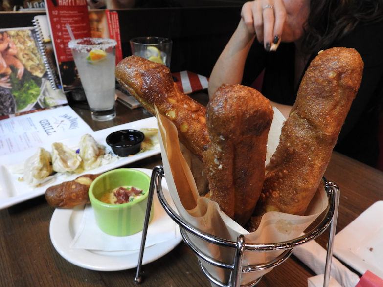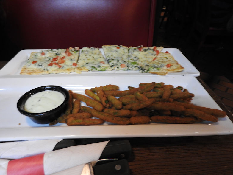 The food was great we had these pretzel breadsticks with a tasty cheese sauce, pot stickers and fried up green beans with this nice spicy dressing. We also had a cheesy spinach flat bread and some drinks to go with it. I had a couple long island ice teas with a Terra Massu martini which btw cost 13 dollars not sure why another reason why I gave it four stars because its not a huge martini and they really should charge half that cost. Cheaper drinks means ill be likely to order off the menu more most people agree with me.