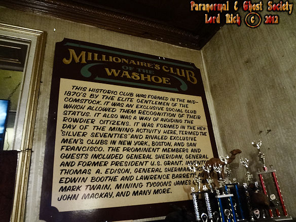 Despite the clubs millionaire history in relation to this location it has a much darker history then a few millionaires sharing a few drinks and pleasures. Back in the day grave diggers would store bodies in a room today that is called "The Crypt". The winters were very cold thus the ground was to frozen to dig the graves thus they stored bodies within the Washoe Club even during normal business functions. You could be drinking or playing poker never even realizing that in just a few rooms over a cadaver remained on ice. Today it seems to be a focal point for many paranormal groups to conduct their investigations at. Little do others realize but the room really holds no relevance to its haunting's although activity has been said to occur here I believe most of the haunting's surround other parts of the club.