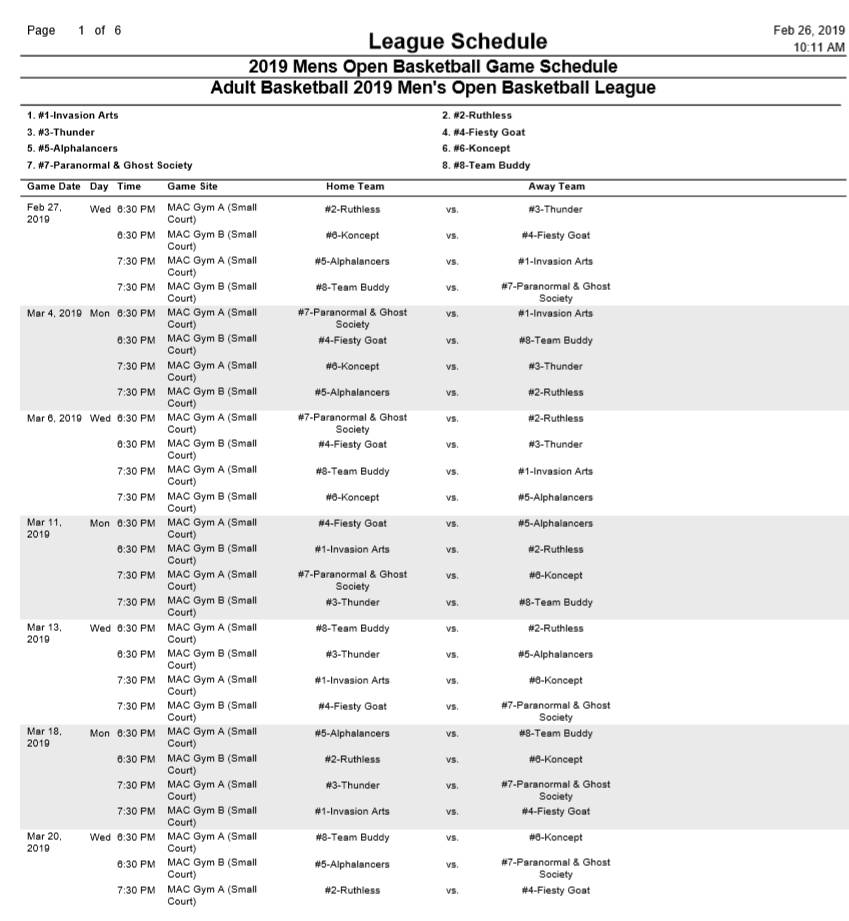 Mens Open Basketball Tournament February 19th - April 24th 2019