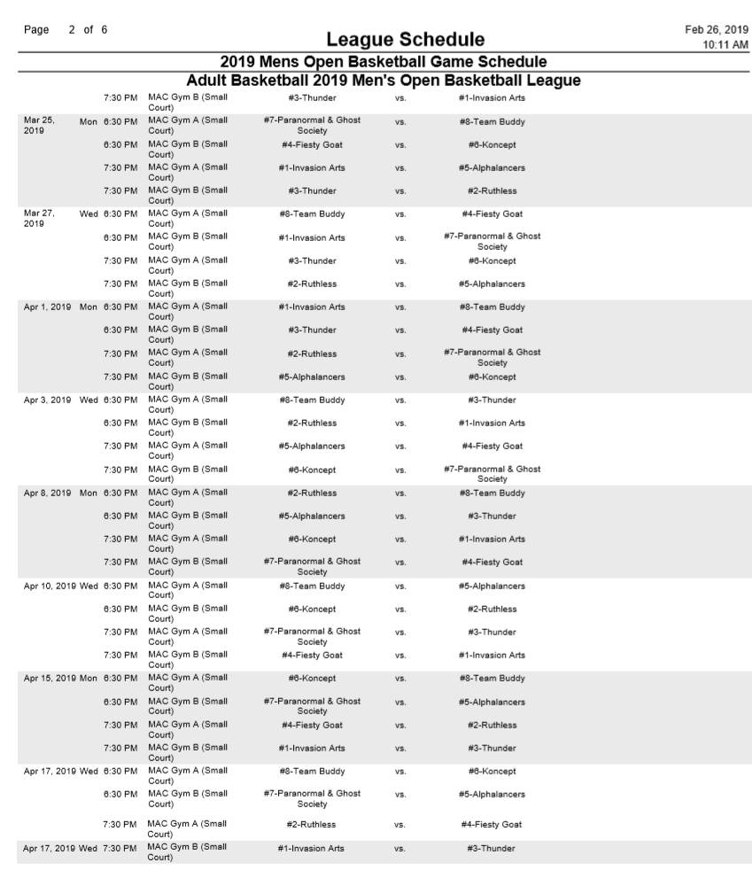Apr 1, 2019 Mon 6:30pm Invasion Arts 53 Team Buddy 56 -- --