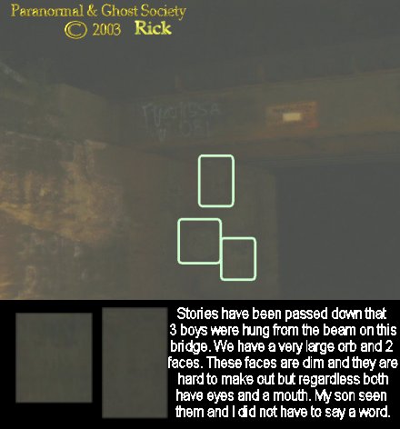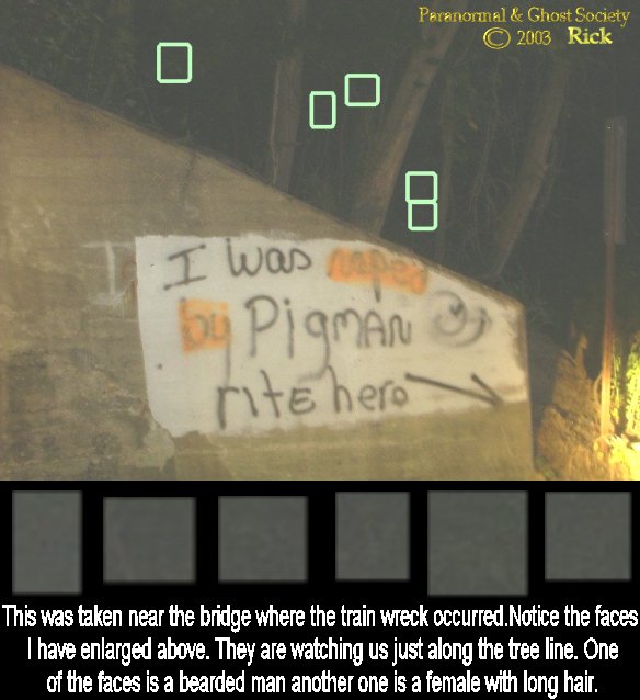 Subj: [ParanormalGhostSociety] Tonight's Spooky Investigation Report.... Date: 8/2/2003 1:52:37 AM Eastern Daylight Time From: AngelOfThyNight@aol.com To: ParanormalBuffalo@yahoogroups.com , paranormalghostsociety@yahoogroups.com Tonight Mark and I decided we would do a small investigation. The evening was very warm it was very calm no winds, no rain, stars out so we headed out to Pigman's Road. The history I will get into later on when we add this to our site. I have to admit this is one of the most terrifying roads I ever investigated far worst then the Blackstone Rd or Delaware Street investigations. We headed off around the evening after playing some Frisbee, eating some Chinese food and then off to the road we ventured too. The sun just went down behind the trees and I drove the whole length of the road. We went through the first tunnel which supposedly it is said that 3 boys were hung from its beams headless. Then we headed to a second much longer tunnel where only one car could go through this one bothered me alot just driving though it. Both tunnels have separate train tracks above them. We drive to the end of the road turned around then we parked. As soon as we got out of the car a train was flying by over the tracks in the distance. We walked up the road and to the left we seen a valley with a tunnel we decided not to visit the tunnel because we wanted to check the road first. So we came across the first road tunnel which goes about 50 feet in length give or take. When we came out the other side we were taking photos and we heard an odd sound. It sounded like a lawn mower on the train tracks I said nahh just probably an 4-wheeler but the strange thing is I could not seen anyone and it was not loud just real quiet motor going by and what's more odd is a train just passed by then this occurred minutes later. Anyhow we sat and listened and about 100 feet off to the left I heard a large crack twice almost like the sound of someone walking down the slope or walking in the woods. After it stopped Mark and I walked farther up the road and hit some very major cold spots there was no explanation for them except for something ghostly in nature especially after the hairs stood up on my neck. Also this is not paranormal but there was a bee that flew past us and it was dark the bee ended up hitting the ground when we shined the line it was the largest yellow jacket I have ever seen a black and yellow bee about an inch and half in size I was probably more terrified of that then the road seeing how large it's stinger was lol. We walked down the wooded road and noticed many roads, paths, steep slopes and came to the bridge with the beams. This bridge/tunnel did not bother me the least. I did not feel any uncomfortable here unlike the other tunnel. So we took a few photos and we walked past. Farther down the road we stopped at a trail and looked at some old pipes and we turned back around. Mark stated when I breathed he saw my breath. I tried to get my breath to show over and over in that area and nothing so I do believe he may have see some Ectoplasmic energy close to me since I did feel a cold spot when he mentioned what he had seen. Finally a car flew down the road we pretended to be trees. As we headed back we noticed a few times where 2 cars would stay close together a few cars I thought would stop. Based on what I feel I can feel that these woods, this road and whatever occurred here years ago was not pleasant at all. On our walk back towards the tunnel with the beams quite a few cars passed by and quite a few times I heard something I cannot explain in those woods. Something like a voice at one moment another moment something moving tree to tree as we walked. I did ask if the Pigman was out there to please make himself known. Some people claim that the Pigman is a half man half beast creature again I will get into the history later when I update the page. But after that I felt pretty watched like no matter where we walked we were not alone. When we got to the tunnel with the beams we took a sharp cut to the left and went down a steep slope. We found a tunnel that went underground or for a quite some ways under the hill. The creek ran through this tunnel so that is obviously why it was formed. None the less we did get wet but it was fun as we walked down the creek. The tunnel was interesting there was tons of crawfish some pretty good sized ones. We came out the other end of the tunnel and we were in some pretty deep woods. We walked about 100 feet and found many things that were dumped there furniture, fridges, many old rusted parts, wheels, just about anything you could find that you could dump on the side of the road. I did not like this at all it looked more like an area you throw bodies. But we were talking and standing there in the creek and we were not to far from the other set of tracks or should we say another tunnel up ahead when I heard the sound of a old steam engine it was like chug chug then a big release of steam. I heard steam beyond a shadow of a doubt was this the sound of the train accident that steam cooked over 40 people years ago in one of the cars? After that I felt pretty uneasy and I heard walking in the woods and trust me we were in pretty deep standing in a creek. The branches were like cracks breaking one of them was behind us, another I heard was about 10 feet out in front of us, and then I heard water splashing like something else was walking from the other tunnel towards us. We went back through the tunnel climbed the bank upward and headed back around to the long stone tunnel under the tracks. We did work our way back to the car and I could not help notice all the cars some guys road by shouting gibberish they did not see us but they were shouting, another car got stuck in the tunnel temporarily, and another group of kids driving in the tunnel honked there horns. Anyhow as we worked our way back to the van we were trying to find the tunnels in the valley we