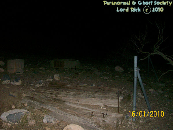We never did find the entire town which boast some walls and foundations of the saloons and stores. I did however find a windmill, foundation, scattered debris, shaft, Bonanza King Mine, water tanks, Bonanza well and few other minor remants of the town. Beneath the windmill is a boarded up shaft even looking through the holes I found the shaft to be extremely deep. Perhaps this was the well and not a shaft at all. But with other mines like Kerr, Rattler, The Mozart etc it was obvious that below the town was a series of tunnels which kept the town thriving for many years. Today the locals still use the town site as a rest stop for horsebackers to give water to their horses. I found many horse shoe prints and manure. The area sits up along the Providence Mountains one of the more prestige mountain ranges in the Mojave. Trust me I know I sat on one of the peaks looking out into the vastness like an eternal darkness. It is very secluded from any local town and thus we found out how hard this place is to access at night. Let me put it into a broader perspective to understand how much work goes into such an exploration at night in the Mojave. Imagine you go down this rocky road for miles....getting out of your car you follow a trail to rough to take the vehicle on. No moon or stars grace the sky its pitch black. You hike for almost an hour not coming up to any foundations or signs of a ghost town. Miles away you behind yourself you visualize a porch light which is a secluded range not being able to tell if its moving slightly or even towards you. The trail begins to get hard to follow as many washes weave in and out of it crossing every so often then all of sudden you reach the well site for horsebackers. Their is a pit which looks eternal covered in boards.....you get ill just looking at it feeling something inside hiding in the darkness. You follow the trail after spending time at the Bonanza Well still unable to find the town site due to hills all around you. The trail begins to to go up a large hill then back down leading you right into a mine at the base of the Providence Mountains. You check out the mine think you hear voices inside...then all of sudden the lights start to dim and run out almost....you still have not found the mill or other parts of the ghost town. Your pressed for time soon to be lost in the darkness. That is why this is such an amazing place so much remains to be seen just with any ghost town remants can be scattered across giant valleys. Providence was a booming town what could be better then to be dead center of the Mojave Desert in search of the ghost of its past! Below is a very good history read on Providence and the mine. This ghost town gets plenty of attention across the web sadly its condition appears to be deteriorating perhaps due to the desert elements or local vandals. My opinion is this is a spooky place at night miles from the car.....trails that go off to nowhere....very rocky terrain.....blind spots from dunes and hills. My only advice for ghost town enthusiast is places like these are way better visited during the day so that you can see the various sites. As ghostbusters or rather paranormal investigators most of the locations we visit are at night which adds perhaps to the mystery or maybe it adds to the challenge of exploring. © By Lord Rick . . .