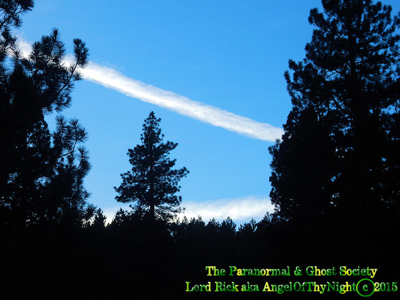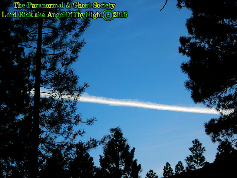 What is the one thing you never seen growing up as a kid? Chemtrails and Contrails! Today they are very abundant some found just over the national forest of the sierra mountain range where drought is more prevalent. Some theorize its just condensation off the wings of a plane and that is partially correct. Our military also has covert projects which involve spraying of Barium and other elements to combat global warming. Its very easy compare the difference between condensation to a chemically altered chemtrail. As with condensation the contrail dissipates very quickly however with a chemically altered contrail it can stay up in the atmosphere for hours possibly. I have seen similar chemtrails like the ones you see in the photo where they will reside for a couple hours then all of sudden the skies darken and it precipitates a little. It appears that many countries have taken an interest in weather modification to help combat global warming but I feel its to late. Then we have to wonder if such chemicals in our skies have long term effects such as causing worldwide cancer which seems to be on a steady climb. Pay attention to the second photo as the second chemtrail is just above the forest trees its very low and were about to get a breath of not so fresh air.