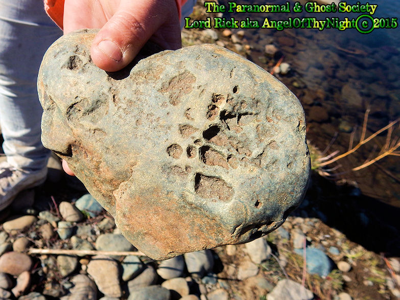 We found this fossil under a rock we tipped over right along the Little Truckee River. Its possible its nothing but if you study it carefully you can see it looks like a wolf paw or something similar to that. Now it might be nothing however it is eroded which might disfigure the fossil a little. I thought it was pretty interesting to share again not paranormal but it just shows our viewers that we leave no stone unturned.