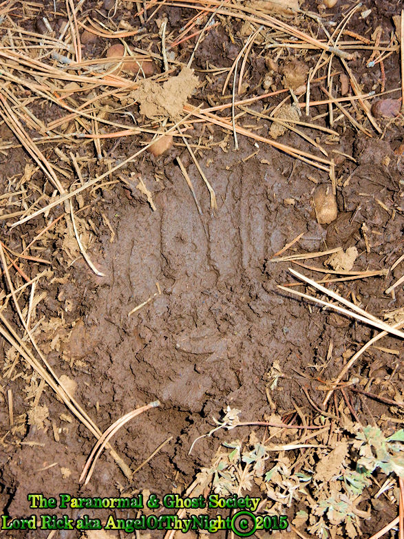 What we first found was the spine of a smaller animal but only a view vertebrae were attached not sure where the rest of the carcass was or extremities like the skull. Not to far away from this site I found what appeared to be a hand print possibly fingers that made an impression in the mud. There is only two creatures with fingers in these parts one being humans the other being Sasquatch. Believe it or not these creatures do walk on all fours and well there hands are hairier but they do resemble that of a humans. The hand print could be anything I do not like to assume but I do try to be thorough in my reports and document our finds honestly. Just as not to far away from the hand impression we also found a giant red spot similar to blood staining the forest floor. Could something have injured itself or fell victim by some predator close by?