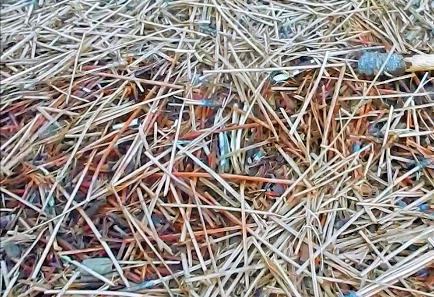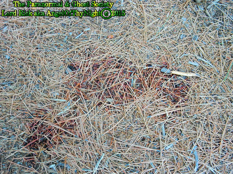 Found roughly 100' away from the hand impression in the mud we located an odd red stain on the forest floor which discolored the pine needles. This could mean various scenarios so I will point out a few. It could mean that someone may have hunted some game such a turkey or wild bird this may have been the kill spot. It could also be someone had a red drink such as Gatorade pouring the rest onto the ground. Also a predator may have killed something at this location but then we must ask where is the rest of the carcass? It also could mean that someone or something like Sasquatch sustained some kind of injury thus falling to the ground earlier leaving behind the hand print then stopped here leaving behind what may be blood. I am open to ideas but I also need to just be open period with this one as I do think the hand print in the mud and this stain go hand in hand together or its just a very strange coincidence.