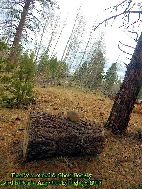 Jarrod and I found a log in the woods sitting on top of it was a very large rock bigger almost then my head and very heavy. Not sure if Bigfoot was using it to tree bang or someone such as a hiker put it here to mark the trail nearby. Sometimes when you see this its a sign that this creature left it there from tree banging recently or communicating with others in the area. It weighed over 10lbs and it was just sitting there so I thought that was a bit strange.