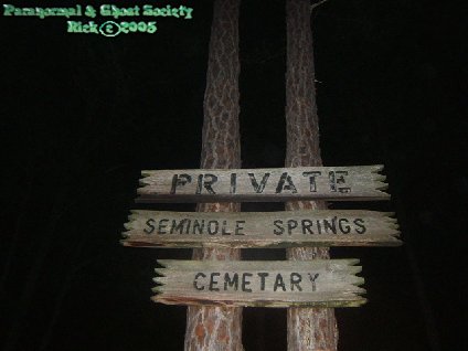 Many of the stones are spread out and when I say spread out I mean you may have a stone alone then not see one for fifty feet. I believe now I could be wrong that the cemetery may have some Seminole origins but if it does not it probably got its name from the fact its in the Seminole Forest which has at least three springs which you will read about in our Seminole State Forest investigation. Their is at least a hundred wood post that stick through the ground within the cemetery each one with a different number. I thought it was kind of odd it actually ruins the whole natural feeling to the area as you seen all these post with metal signs at the top of them. I do not think so much its the history that matters to this private cemetery as much as the fact that it sits in a very desolate area, in the middle of the woods, and on native American ground. That in itself should say enough. One of the gravestones here is missing the other part to it as only a square base sits in the ground. Another thing that really stands out here is the fact that its very pitch black if you had no light you probably would not even be able to see where your going. Their is woods on both sides and it goes back for a few hundred feet to a point where you cannot even see your vehicle. Other then that I have no further information on this place just that it is one of the creepiest cemeteries I been to in the many I have visited in central Florida. The ghost here seem curious but rather keep their distance. Their is perhaps feelings of what are you doing here since its a private cemetery. So the ghost probably were a little surprised to see a group of guys get out and start taking photos. But it is what it is a cemetery with perhaps a ghost story or two of its own to tell. © By Rick-AngelOfThyNight