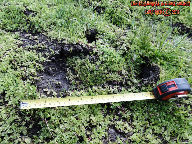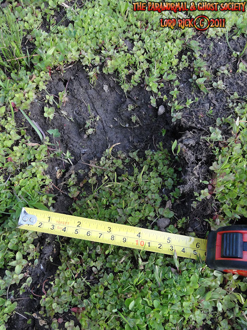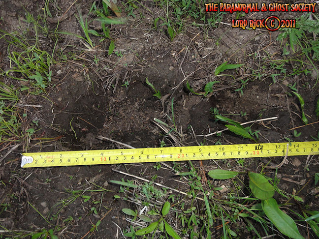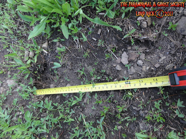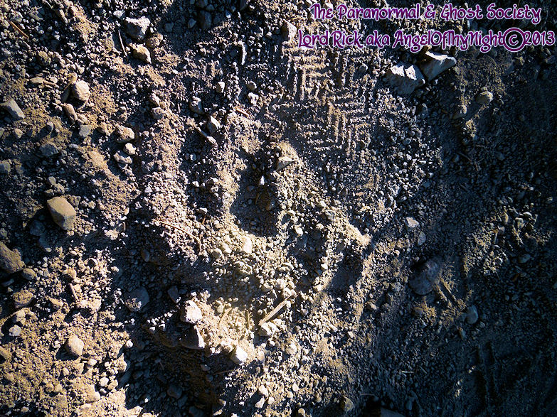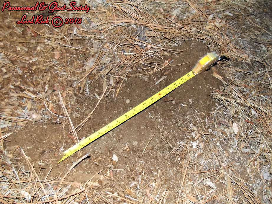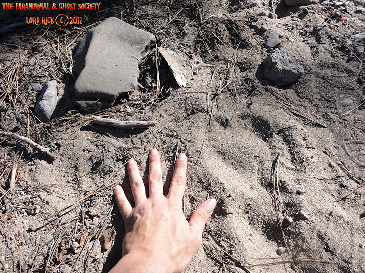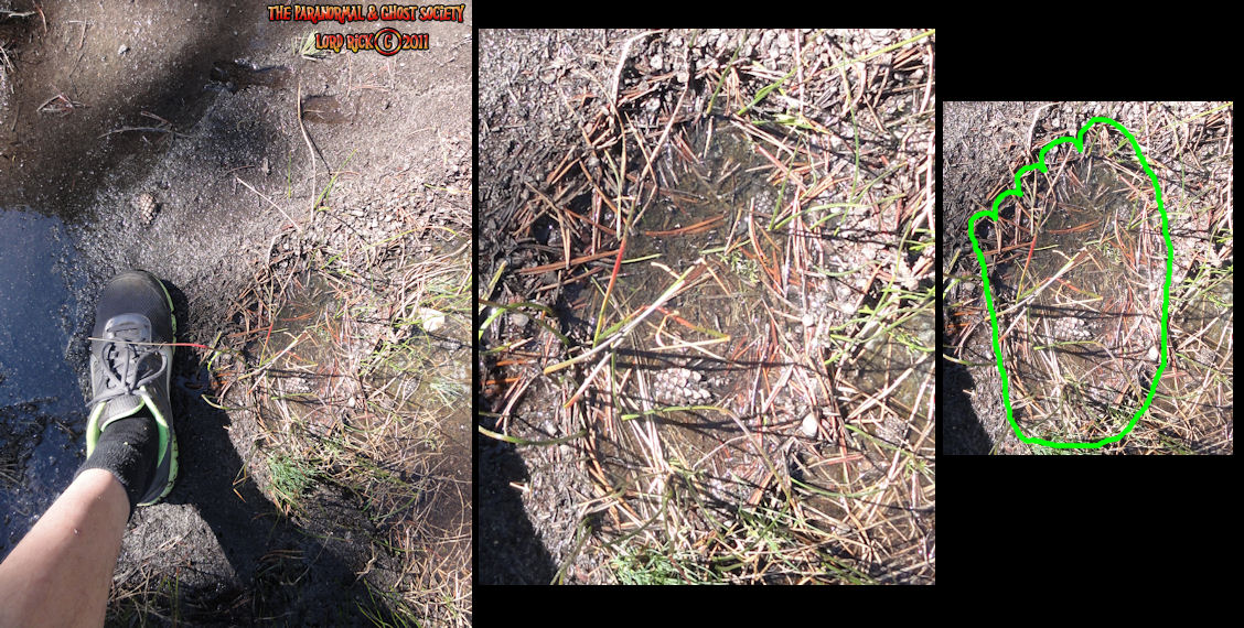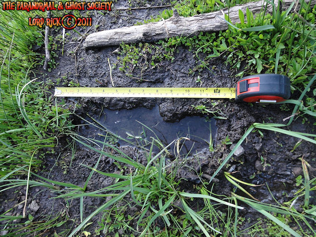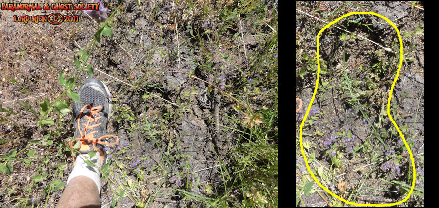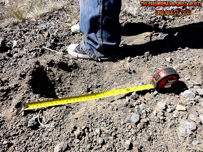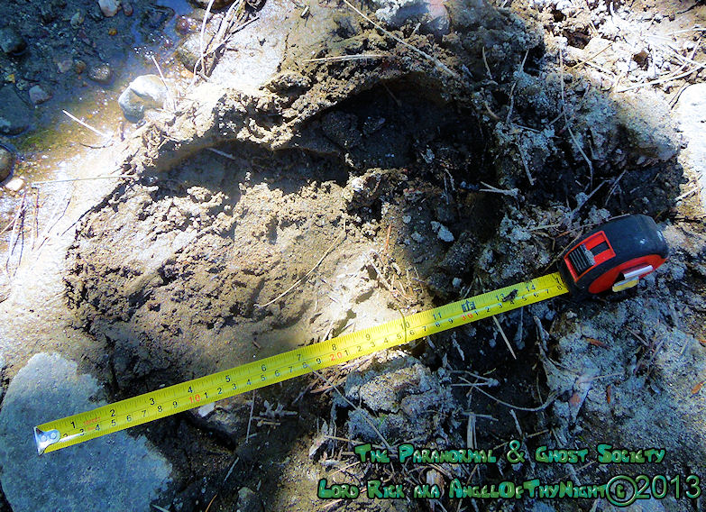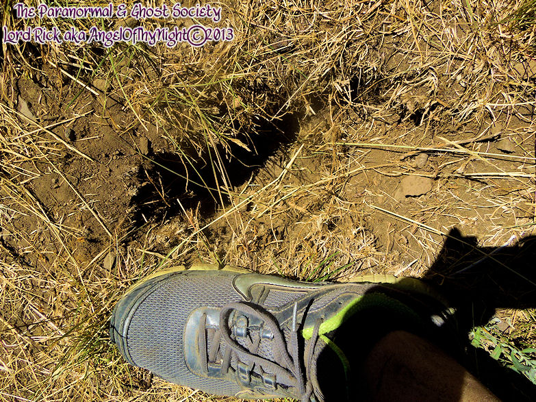 These tracks measure 20" in length so whatever made them was MONSTEROUS! I have used a variety of comparisons to show you different aspects. The photo to the left is a measurement of its length then the photo above to the right shows the strides. Further below is a size comparison of the track as to my foot. My shoe size is a 13 whatever made these would have to be a giant. For further photos of these monster tracks and video see further below!