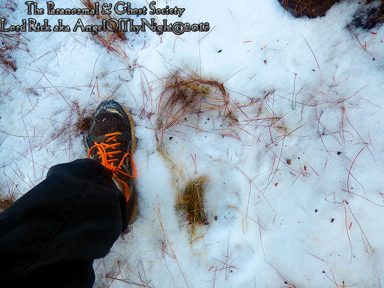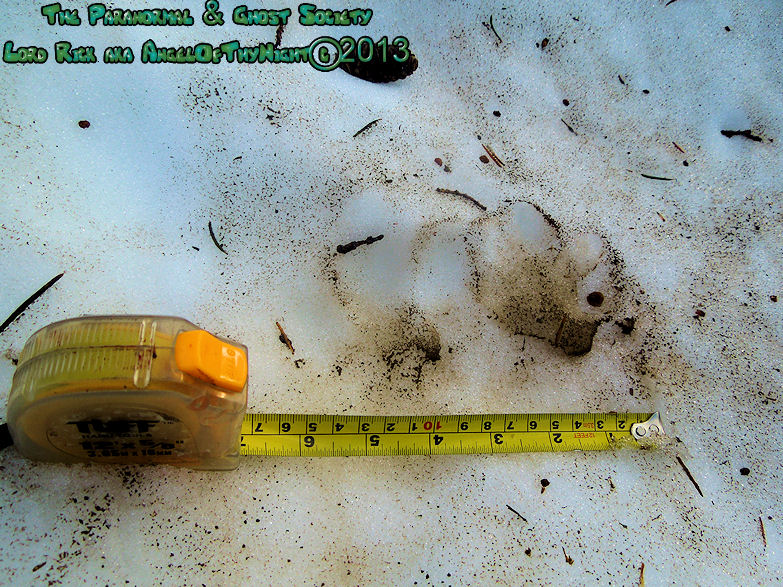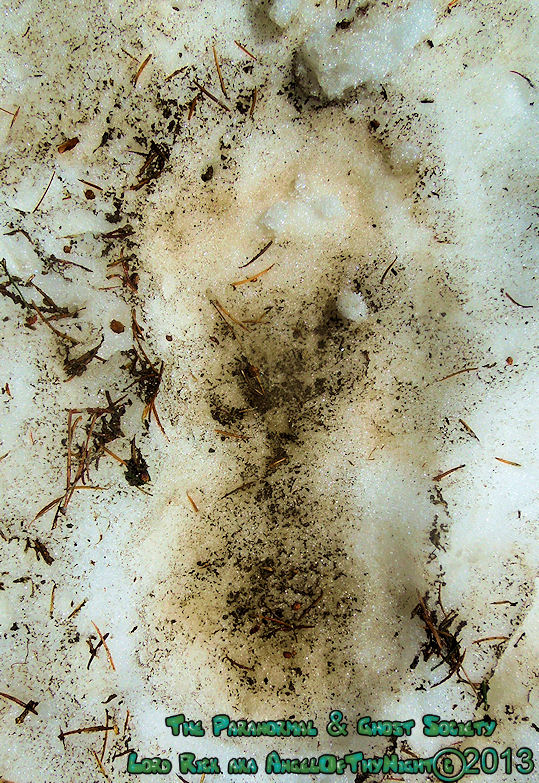 Its so hard to say what formed this track considering its massive size it could just be a humans where the snow melted causing its massive size. At the time I did not think about measuring it but I did notice that their were gentle impressions at the tip of it where it looked like some toes touched down. You can see the dirty is pushed upward as to where the toes would strike down.