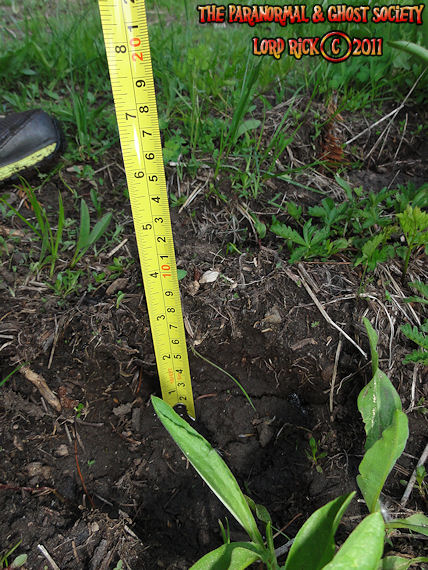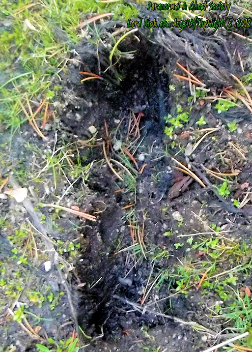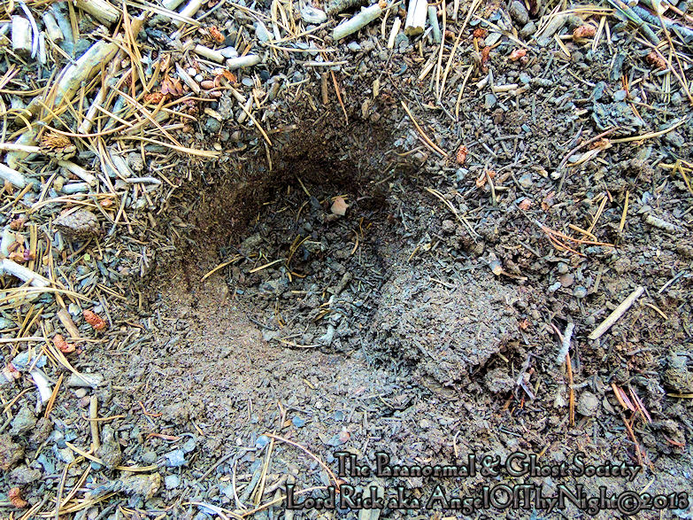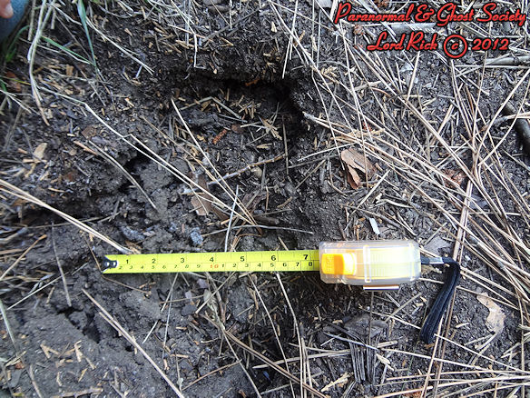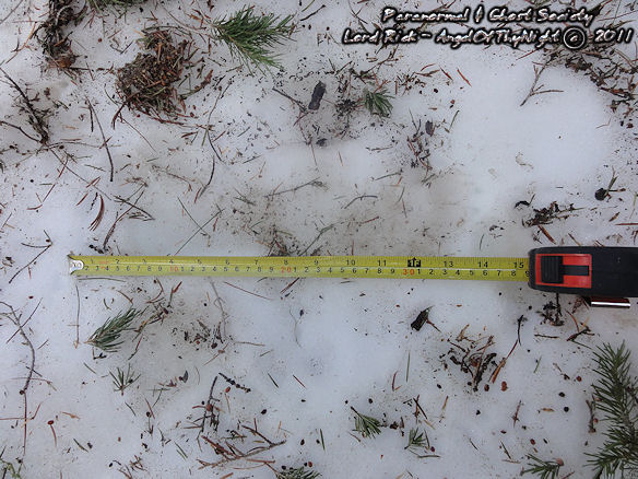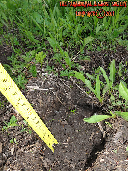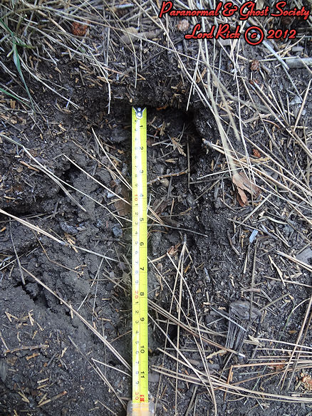 These are depths of two of the tracks found at the track site which vary from 2.5" all the way to as deep as 3.5" which means whatever made them had a significant weight and size. Although the ground is softer at this site its a more secluded area of Red Lake and that is why our team decided to hike here.  The tracks are very unusual we found here as they carry toenail scrapes, depth, width, considerable length and toe impressions. What is even more unusual is a couple of the tracks emerge out of the brush then they head off into the forest going up a slope behind where these were found.