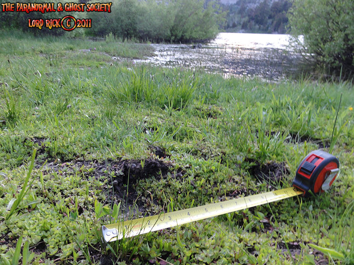 More tracks found at Red Lake in an area that is overshadowed by Devils Ladder and Red Lake. The track to the left is around a foot large however the track in the right hand photo is clearly about 14" in length. Not all Bigfoot grow to have massive feet some of them particularly the adolescents carry a much smaller foot with a fairly large width. These tracks derive fromt he lake while the other one emerges from some brush near the lake shore.