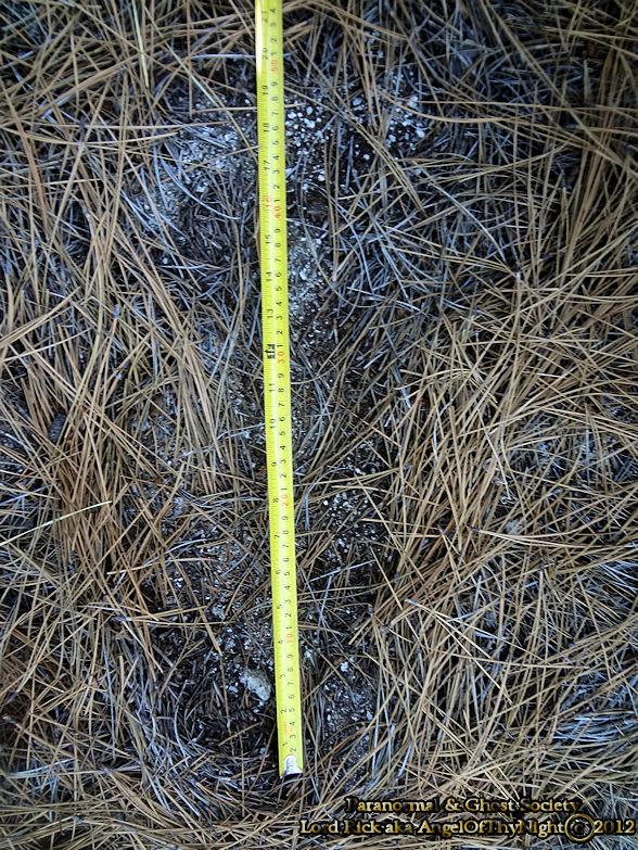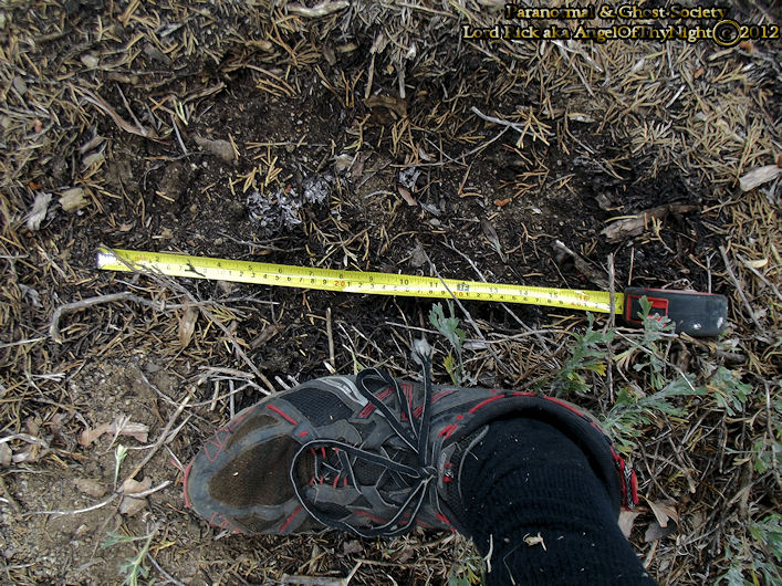 This massive track was discovered deep in foliage of Highland Canyon the gateway into the Iceberg Wilderness. It is about 18" if I were to extend the measuring tape from heal to the toes but I did not want to contaminate the impression. It is obvious that something large came through here and it was heavy enough to sink itself fairly deep in the earth brushing the pine needles, rocks and twigs. This had to be a monster that came through here and it was in a very primitive area of the canyon.