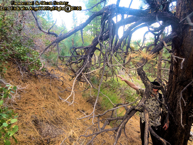 This track was found along a deer path underneath a tree on a high up ledge that we had to climb up onto. Whatever made it must had stood still here awaiting its prey as their were signs that deer used the narrow path to traverse the mountain. Although the track is a bit disfigured it was obvious that whatever made it left an impression of over 16". Below is the tree where numerous branches were found broken particularly at around the 7' height.